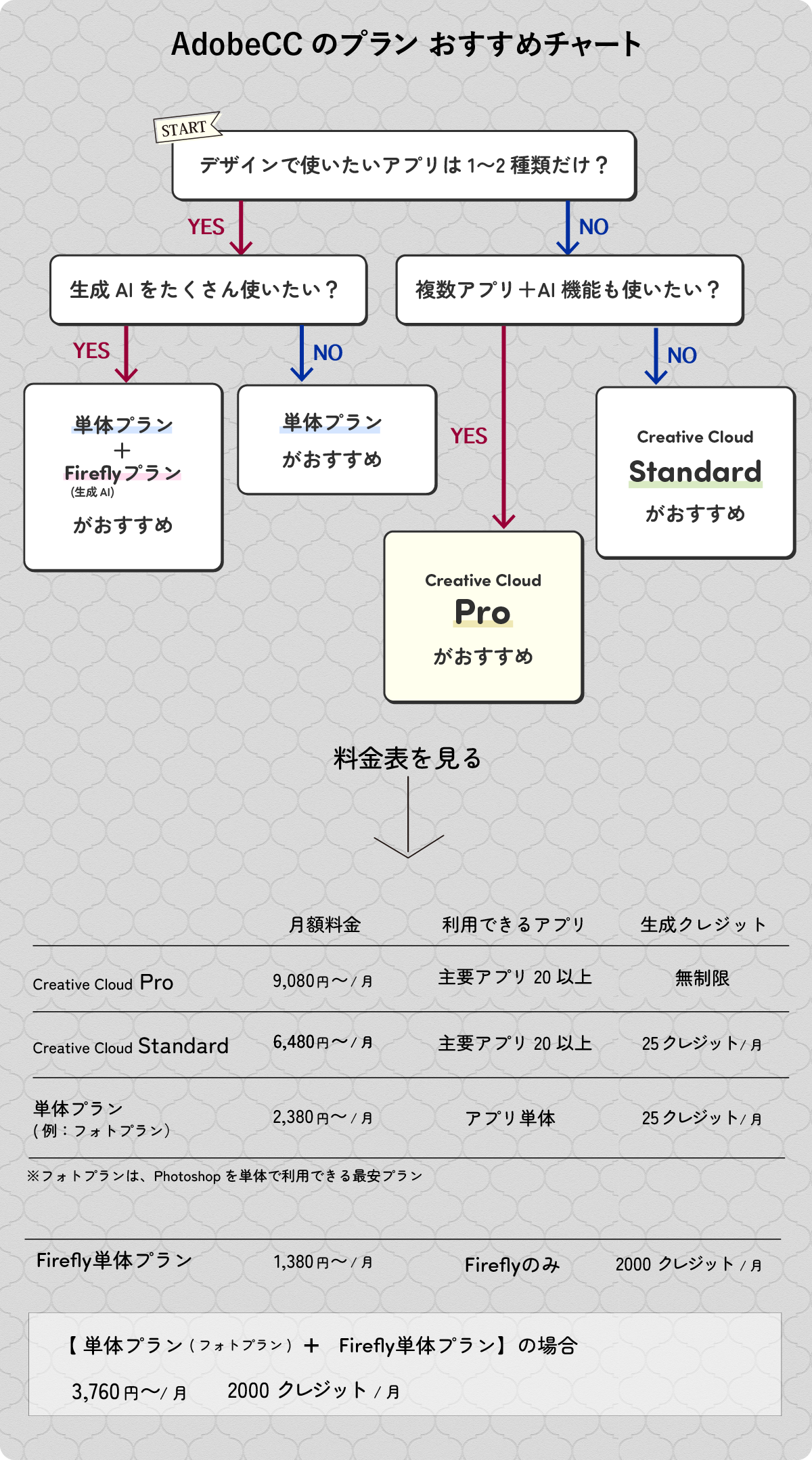 単体アプリ+AIを安く使いたい | ・単体プラン+Firefly Standard | コスパ◎ |