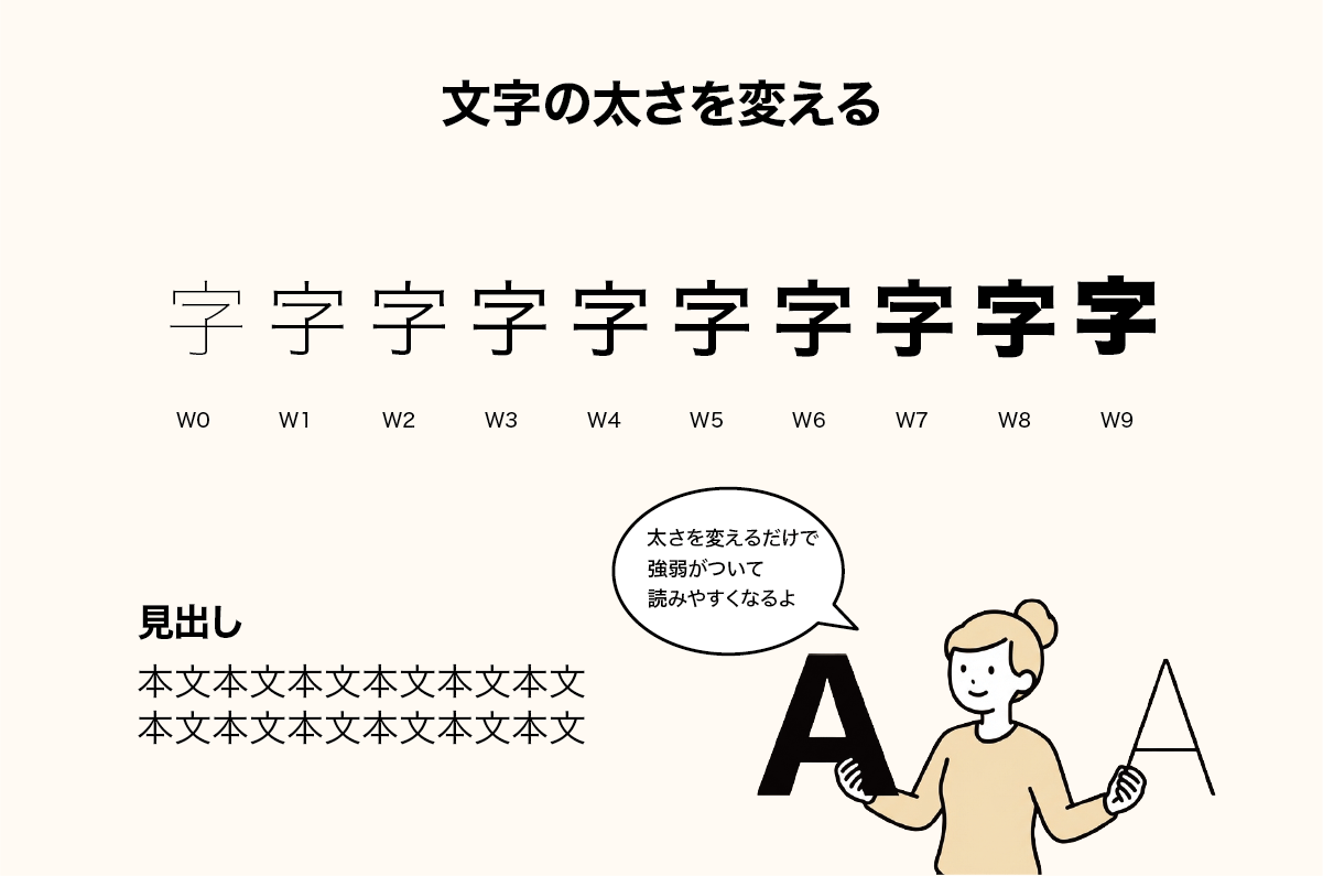 見出しを太く、本文を細くすることで、読者の視線を誘導する「ジャンプ率」を作ります。