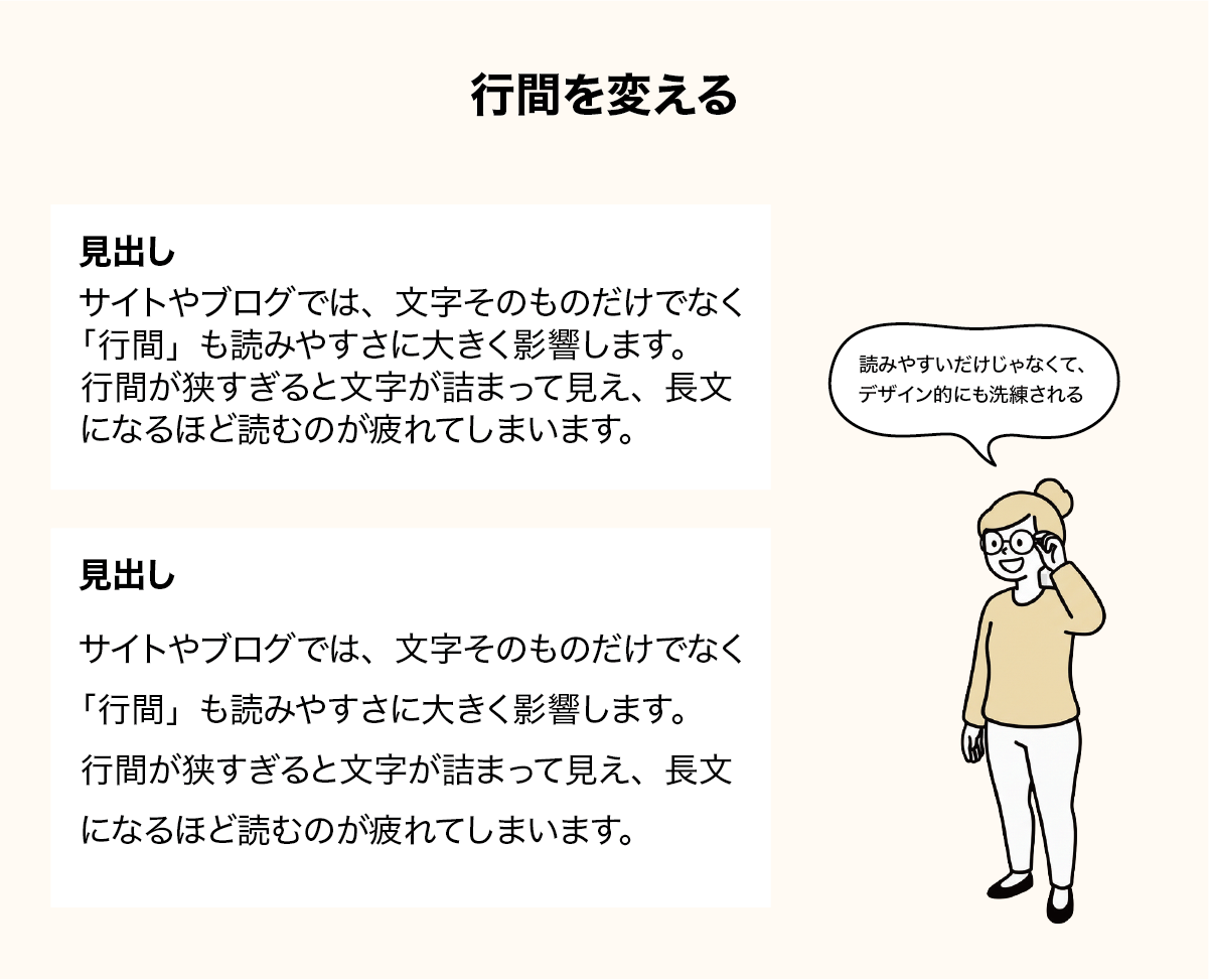 行間を少し広めにするだけで、デザインがすっきり洗練されて見えることもあります