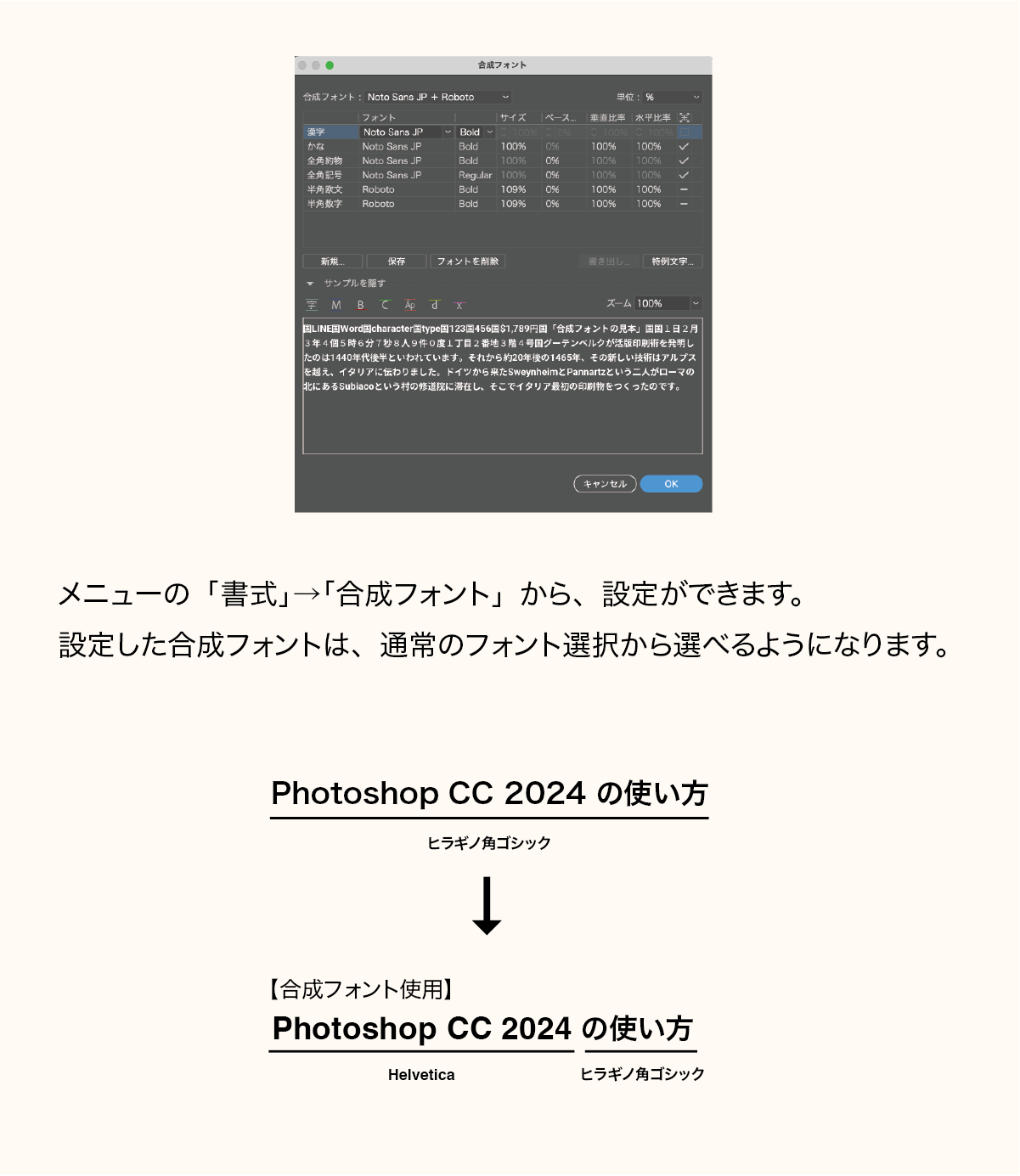 「Photoshop CC 2024 の使い方」のように、日本語の文章に英数字が混ざる場合がありますよね。