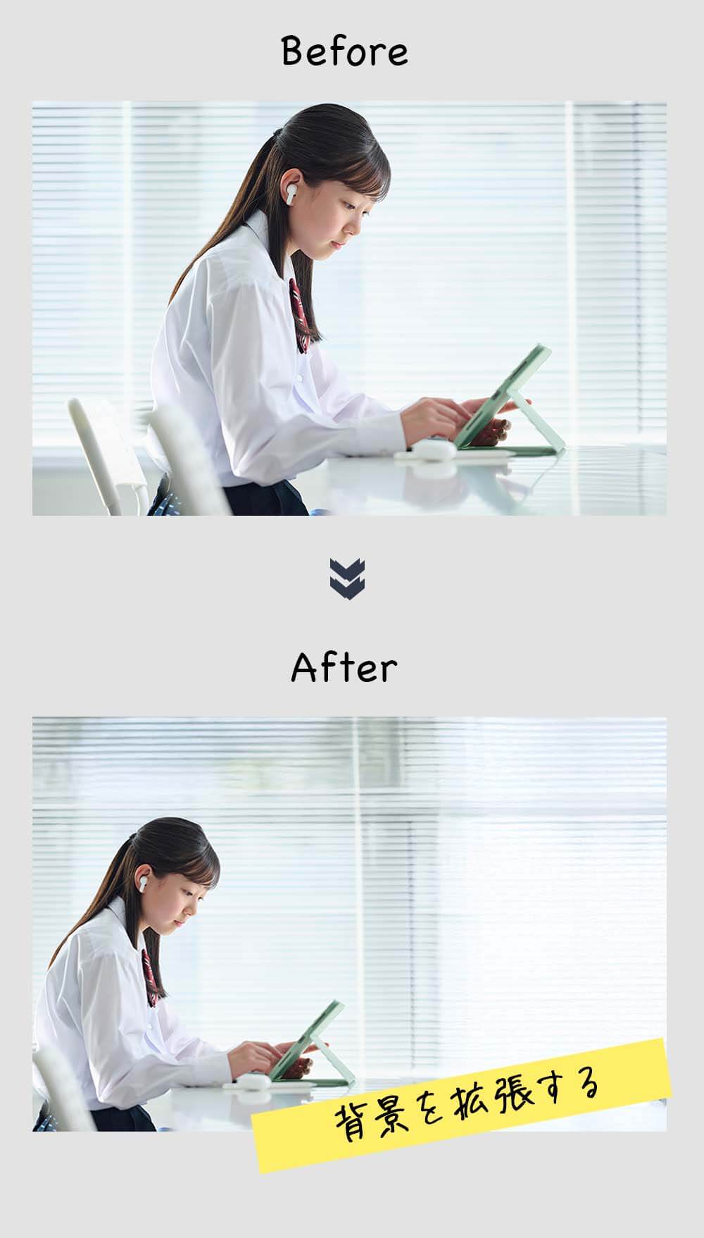AIが写真の外側を描き足して、自然に背景を広げられます。