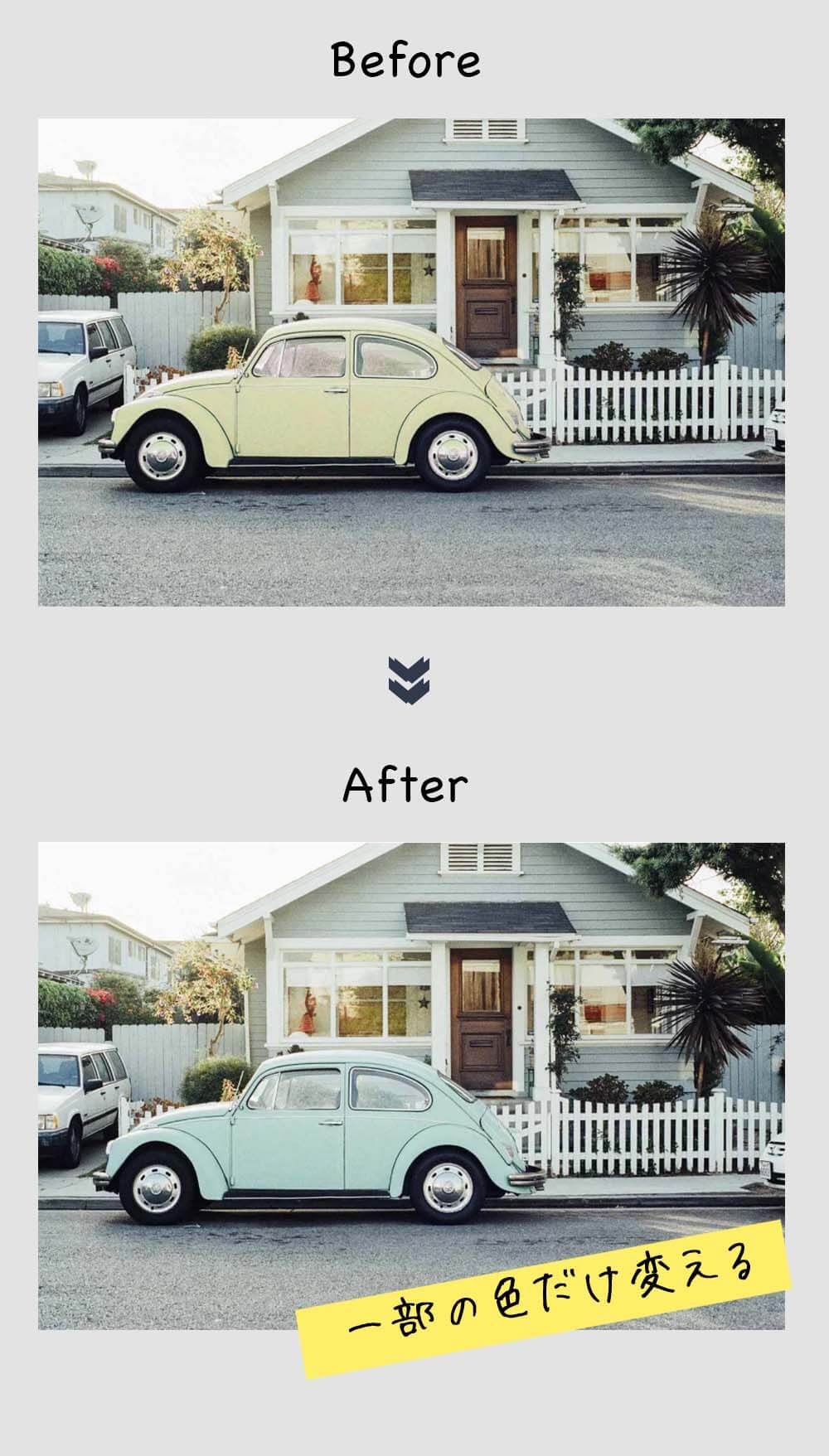 車・花・服など、写真の一部の色だけをきれいに置き換えられます。
