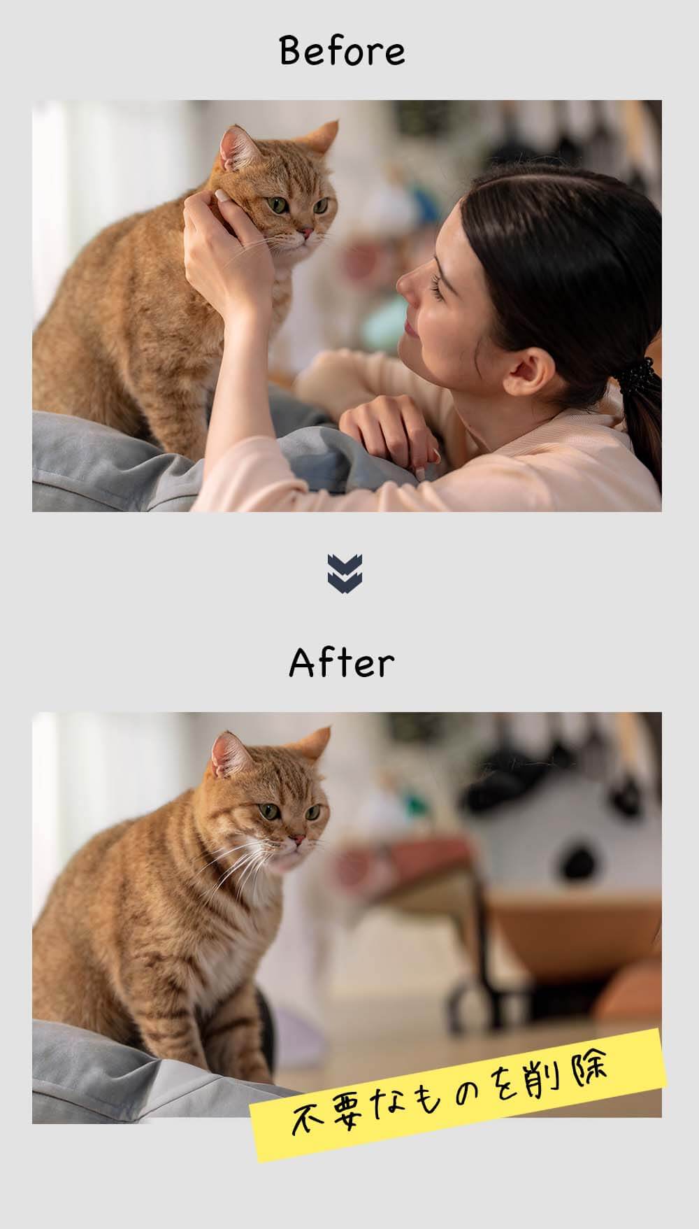 下のケースでは、猫ちゃんだけの写真にしたかったので、可愛がる人間を申し訳ないけど削除しました。