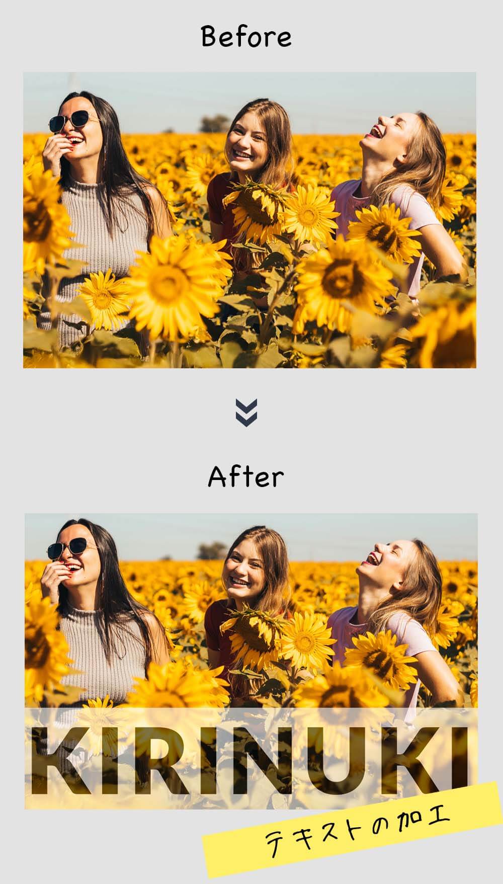 下の例では、文字を切り抜いて、その下に配置した写真を透かしたデザインです。
