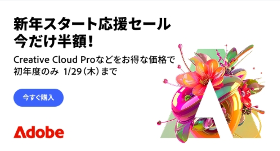 | Creative Cloud Pro | 14,480円/月 | 4,539円/月 最初の3ヶ月が50%OFF | 102,960円/年 1ヶ月あたり8,580円 | 4,000クレジット/月(標準機能は無制限) | 20以上の主要ソフト |