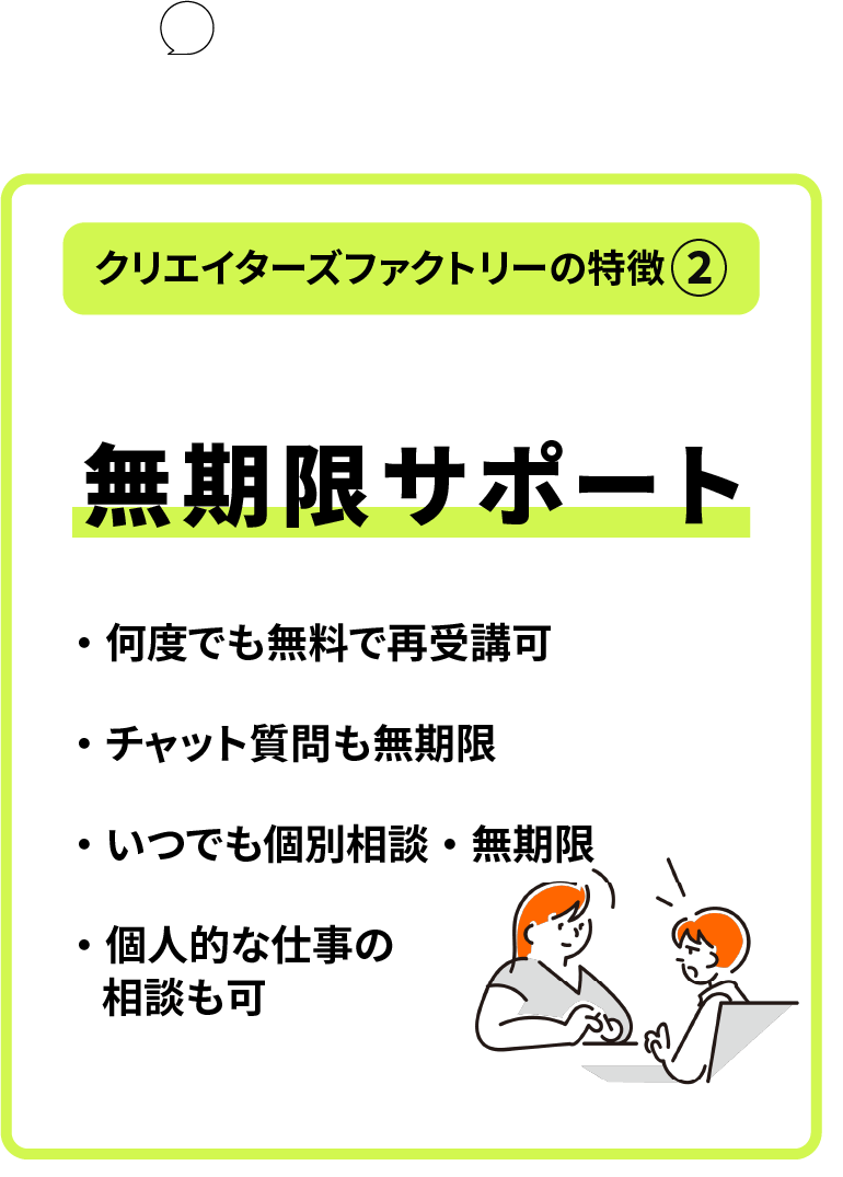 クリエイターズファクトリーでは、サポートに期限がなく、質問も回数無制限。