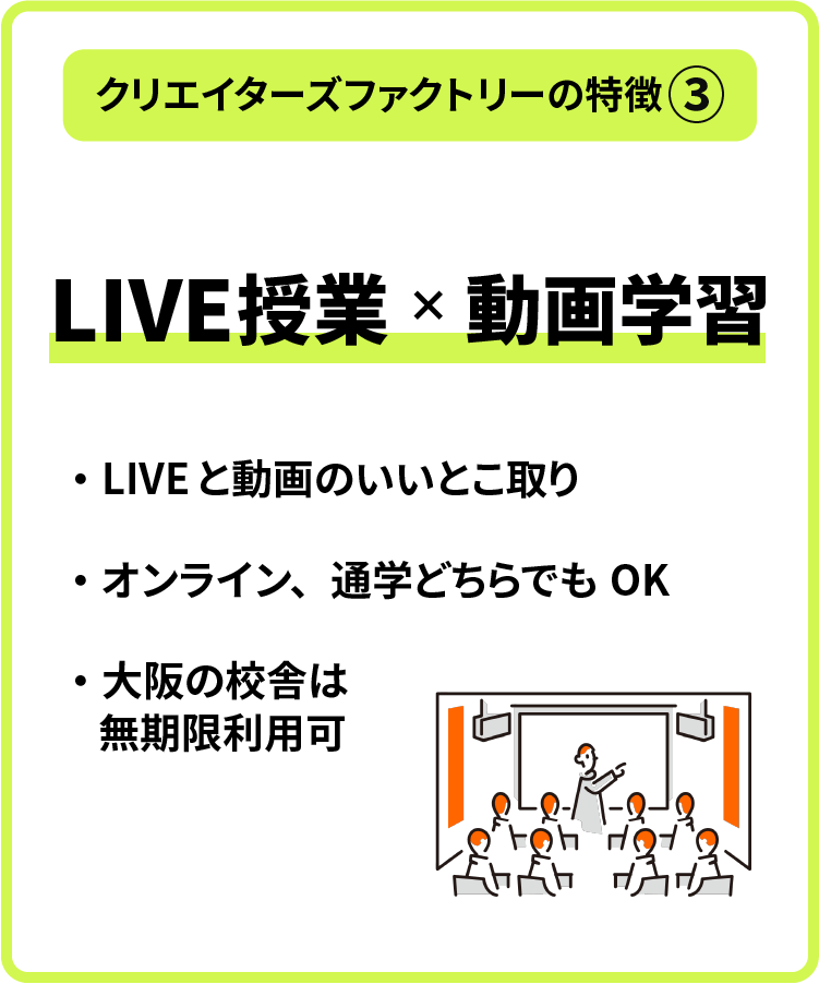 経験豊富な講師によるLIVE授業は、オンライン・通学どちらの参加でもOK。