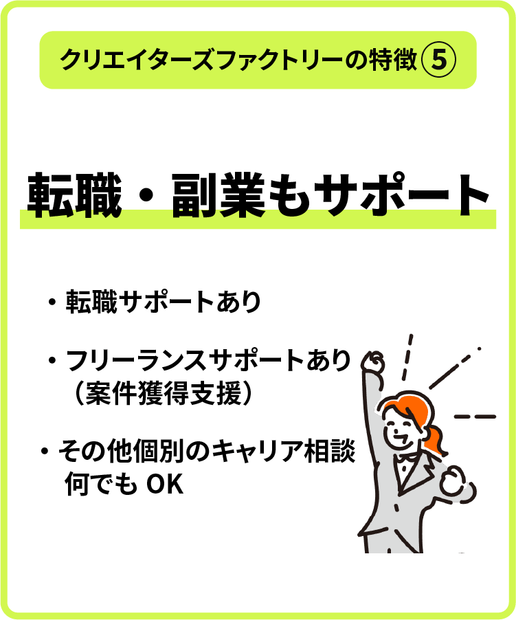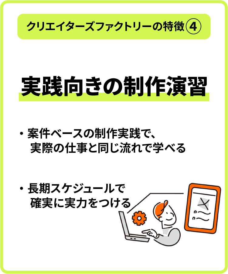 クリエイターズファクトリーのカリキュラムは、「学んで終わり」ではなく、実際に仕事で活かせるスキルを重視。