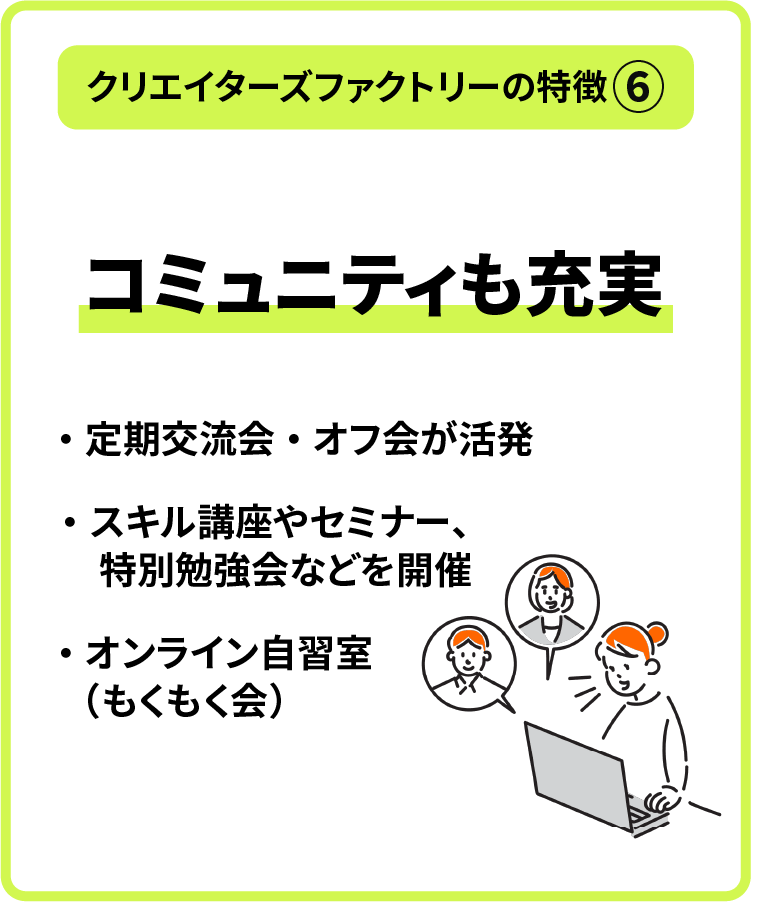 クリエイターズファクトリーは、「卒業がない」という独自のスタイルと、手厚いサポート体制で、初心者でも安心して学び続けられるWebデザインスクールです。
