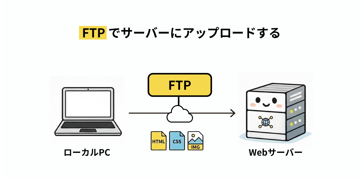 アップロード=FTPでサーバーにデータを届けることと覚えておきましょう。